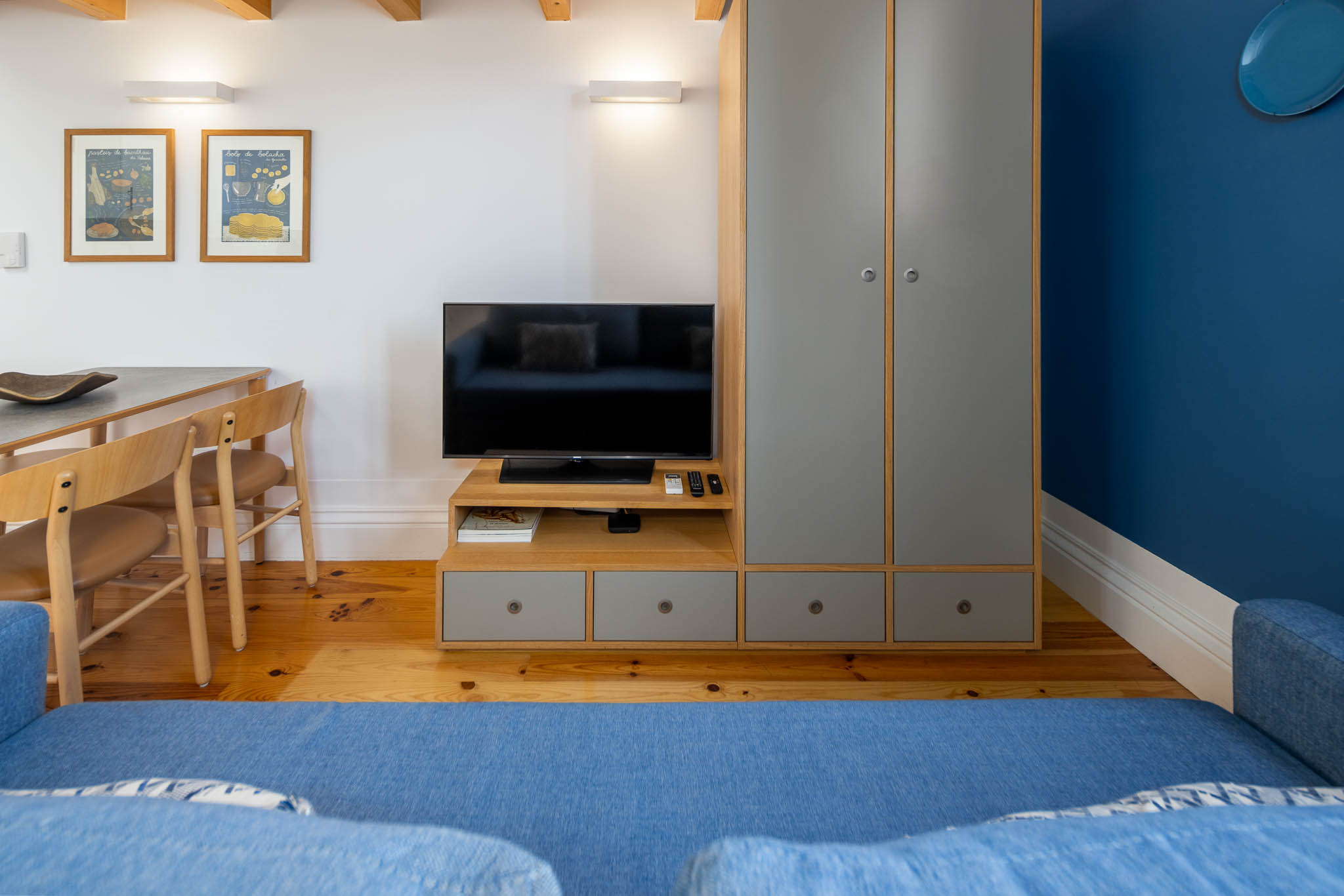 - Uma zona de estar e dormir relaxante com um sofá confortável e smart TV;